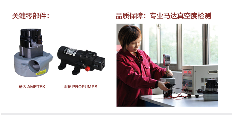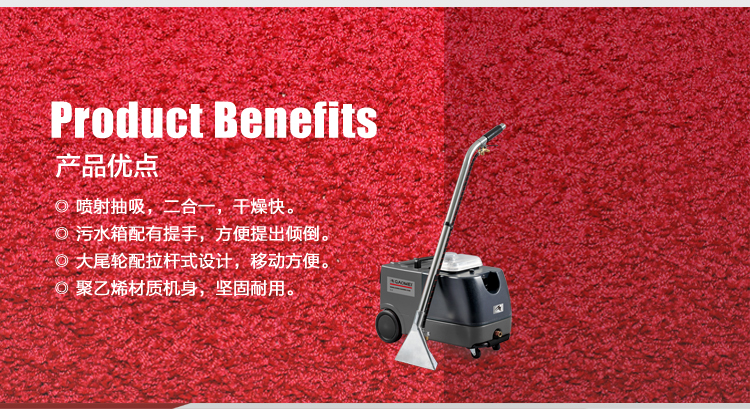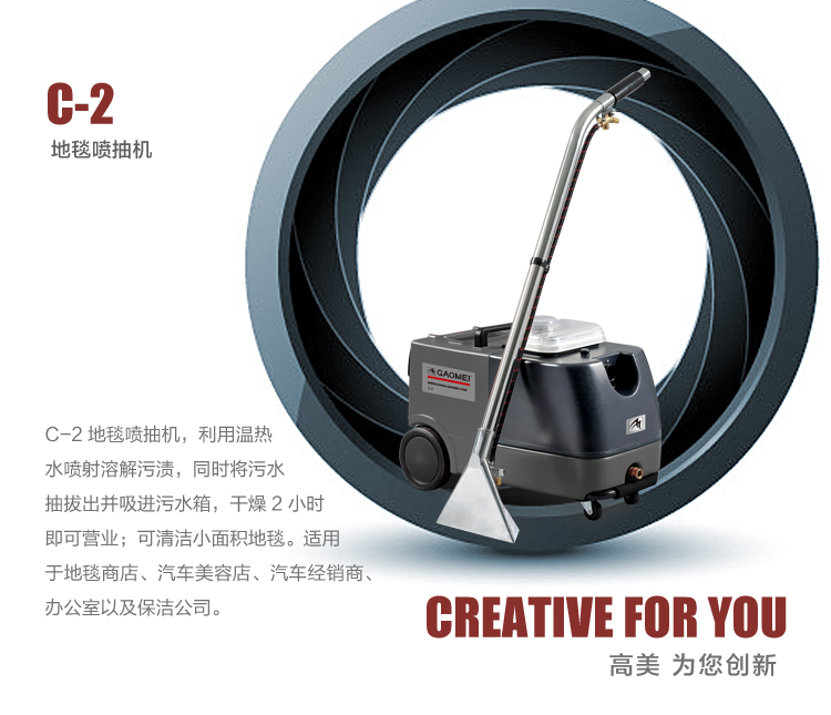 C-2地毯喷抽机 高美地毯喷抽机(地毯清洗机)产品概述: 利用温热水喷射溶解污渍,同时将污水抽拔出并吸进污水箱,干燥迅速,2小时即可营业,可清洁小面积地毯。适用于地毯商店、汽车美容、汽车经销商、办公室以及保洁公司。 高美地毯喷抽机优点: ◎ 喷射抽吸,二合一,干燥块。 ◎ 污水箱配有提手,方便提出倾倒。 ◎ 大尾轮配拉杆式设计,移动方便。 ◎ 聚乙烯材质机身,坚固耐用。