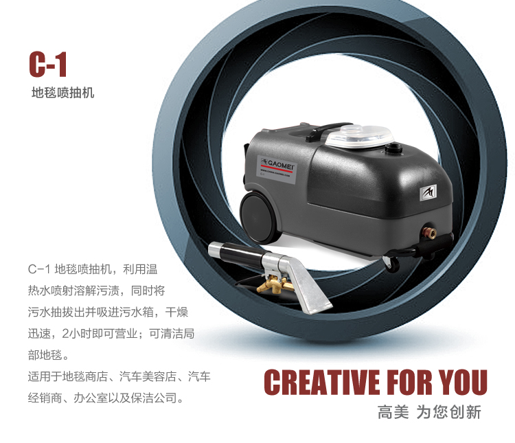 C-1地毯喷抽机 高美地毯喷抽机(地毯清洗机)产品概述: 利用温热水喷射溶解污渍,同时将污水抽拔出并吸进污水箱,干燥迅速,2小时即可营业,可清洁局部面积地毯。适用于地毯商店、汽车美容、汽车经销商、办公室以及保洁公司。 高美地毯喷抽机优点: ◎ 喷射抽吸,二合一,干燥块。 ◎ 污水箱配有提手,方便提出倾倒。 ◎ 大尾轮配拉杆式设计,移动方便。 ◎ 聚乙烯材质机身,坚固耐用。